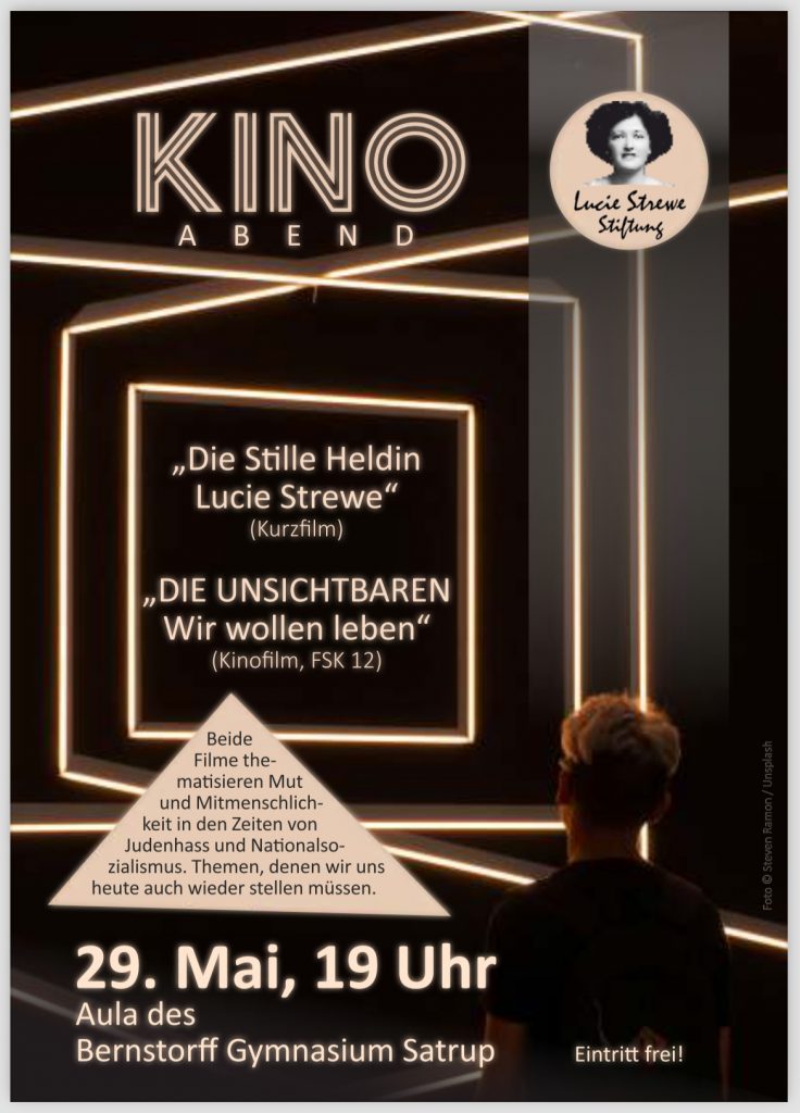 Bei der öffentlichen Filmvorführung in der Aula des Bernstorff-Gymnasiums in Satrup am 12.6.2024 wurde das Filmprojekt der Lucie Strewe Stiftung realisiert und der Kurzfilm „Die Stille Heldin Lucie Strewe – Eine Judenretterin aus Berlin“ sowie der Spielfilm „Die Unsichtbaren – Wir wollen leben“ gezeigt. In der anschließenden Aussprache betonten ZuschauerInnen die besondere Qualität des Spielfilms, der in seiner Form berührend und Mut machend zugleich sei und mit dem Portrait von Lucie Strewe abgerundet werde.
