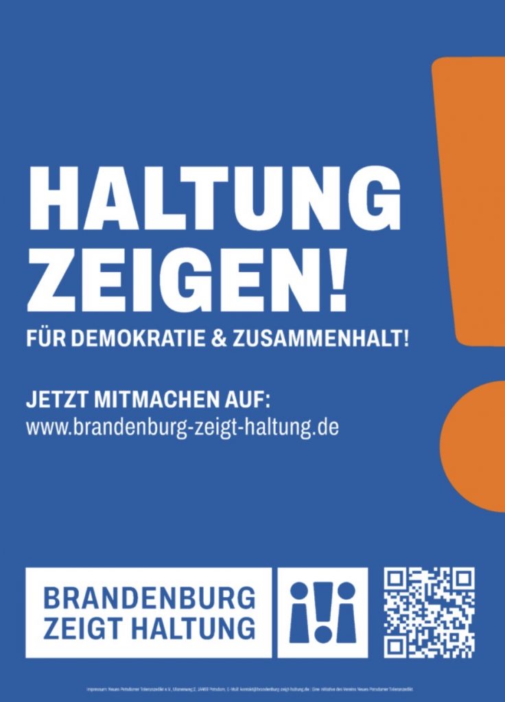 Das Bündnis „Brandenburg zeigt Haltung! Für Demokratie und Zusammenhalt“ ist im Januar 2024 mit einem Aufruf an die Öffentlichkeit getreten, in welchem es zu Haltung und zum Einsatz für Demokratie, Offenheit und Toleranz aufruft. Und weil wir uns als Stiftung ebenfalls für diese Ziele einsetzen, haben wir auch den Aufruf unterzeichnet.